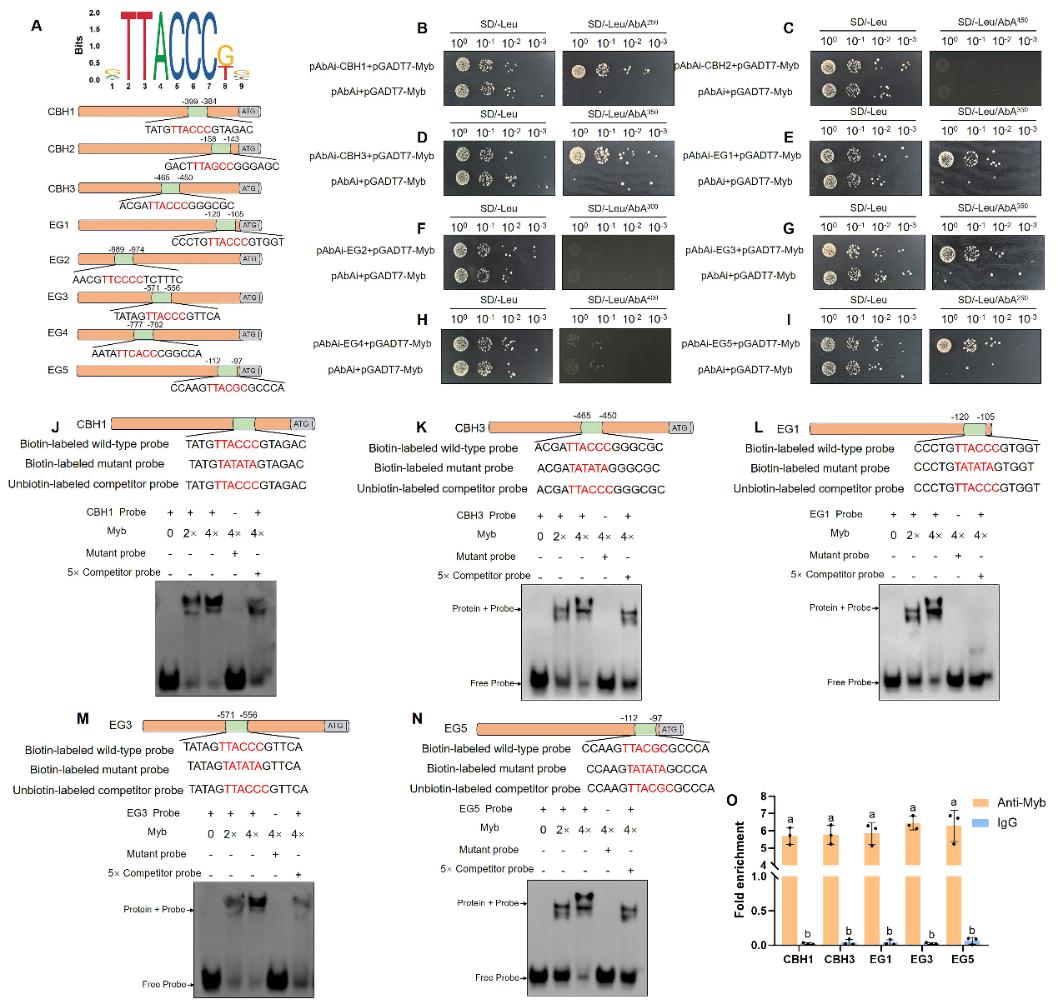 在本项研究中探究了丝裂原活化蛋白激酶GlSlt2调控灵芝利用纤维素的作用机制,通过酵母双杂交筛库、双分子荧光互补实验和免疫沉淀实验发现,GlSlt2能够与R2R3型Myb转录因子相互作用,并且GlSlt2磷酸化修饰GlMyb的第245位丝氨酸。进一步通过酵母单杂交实验、EMSA和ChIP-qPCR证明GlMyb的245位丝氨酸磷酸化促进其与多个纤维素酶相关基因启动子的结合(纤维二糖水解酶CBH1和CBH3、内切葡聚糖酶EG1、EG3和EG5),并促进纤维素酶基因表达。本研究揭示了灵芝纤维素利用的作用机制,这些见解为生物质转化和生物圈碳循环奠定了基础。