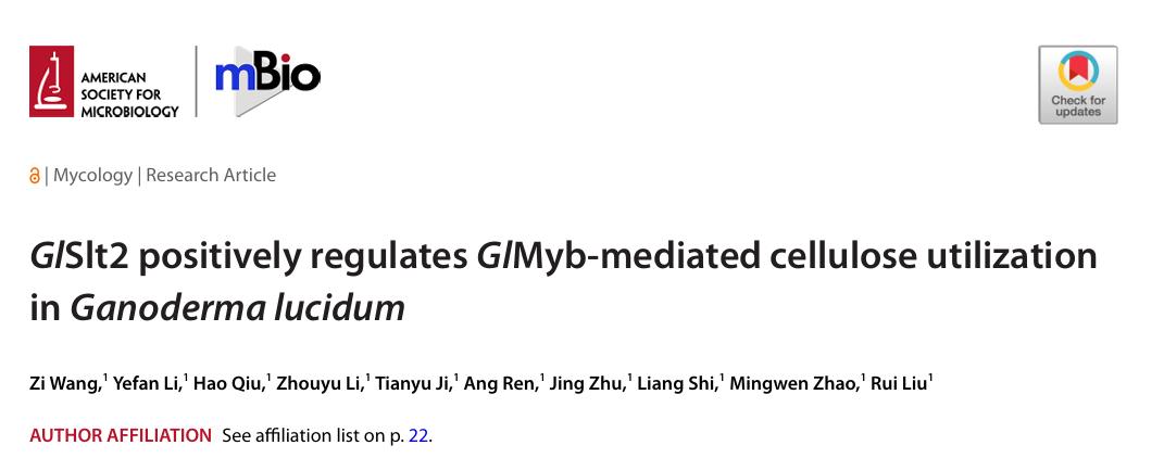 近日,微生物权威期刊mBio在线发表了生科院赵明文团队最新研究成果,题为“GlSlt2 positively regulates GlMyb-mediated cellulose utilization in Ganoderma lucidum”。该研究揭示了灵芝丝裂原活化蛋白激酶GlSlt2通过磷酸化修饰转录因子GlMyb促进灵芝纤维素利用的机制。