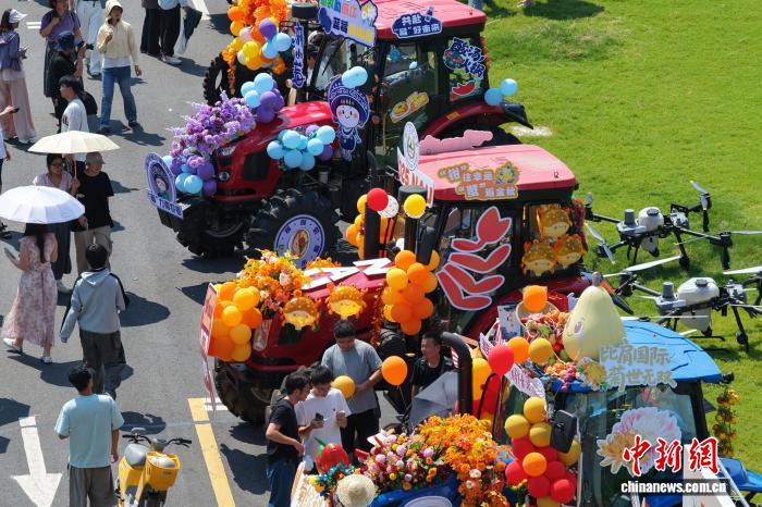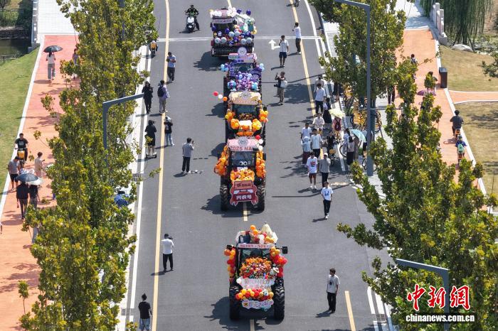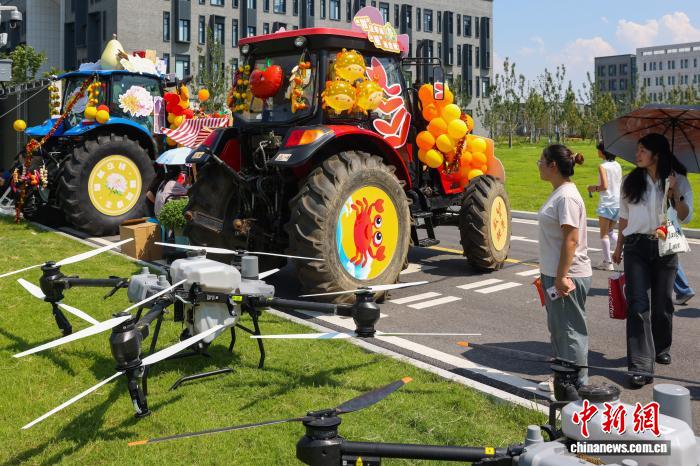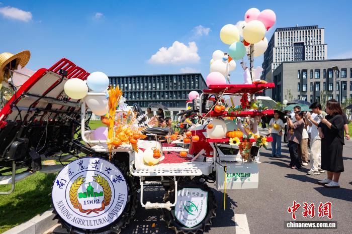 9月16日,在第八个中国农民丰收节即将到来之际,ac米兰官方网站举办别开生面的“科研展陈+花车巡游”主题活动,“‘菊’世无双号”“‘钳’力以赴号”“‘稻’梦空间号”“‘莓’力南农号”“工造未来号”等寓意着“五谷丰登”的主题花车依次亮相在校园大道上,将科技创新与乡土风情巧妙融合,共庆丰收盛景。图为花车吸引师生们前来欣赏。(无人机照片)中新社记者 泱波 摄