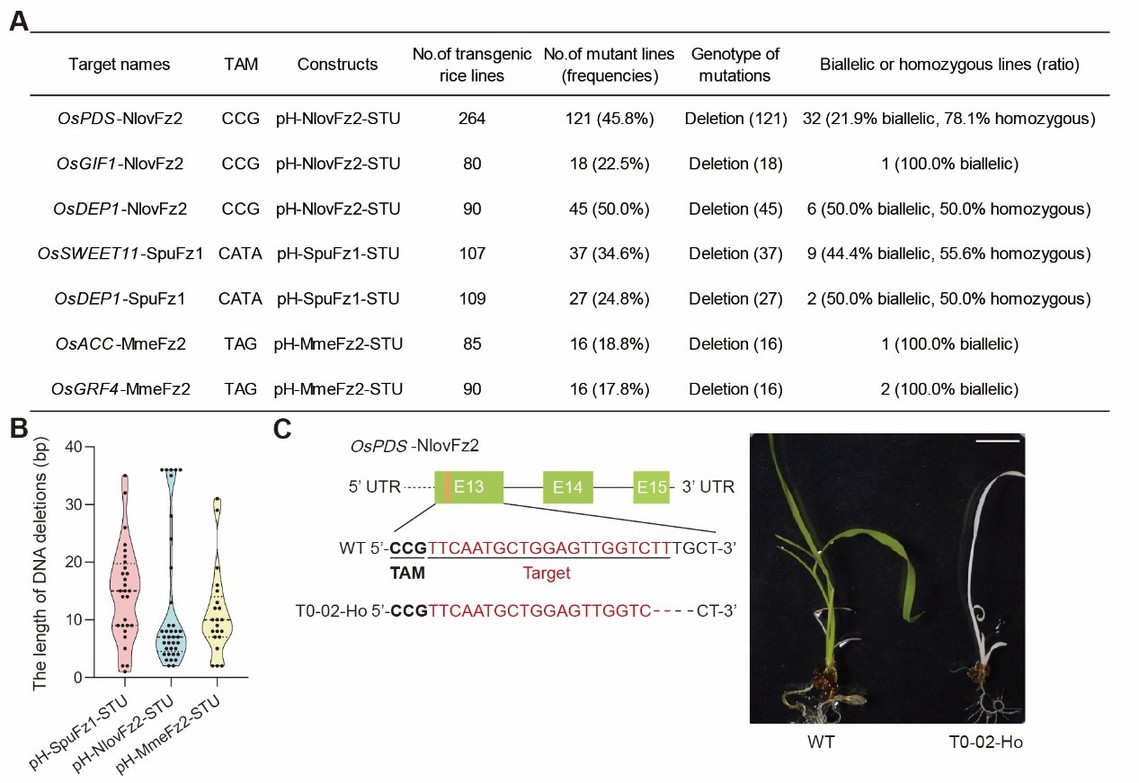 研究团队进一步利用农杆菌介导的水稻遗传转化体系,检测了OMEGA-Fanzor系统在栽培种宁粳7号中的编辑效率。结果显示,NlovFz2的编辑效率最高(22.5%-50.0%),随后是SpuFz1(24.8%-34.6%)和MmeFz2(17.8%-18.8%),且编辑事件均为2-36 bp的DNA小片段删除。其中,NlovFz2成功在编码水稻八氢番茄红素脱氢酶OsPDS的第13外显子靶点处产生编辑,并得到了具有白化表型的突变植株(图3)。