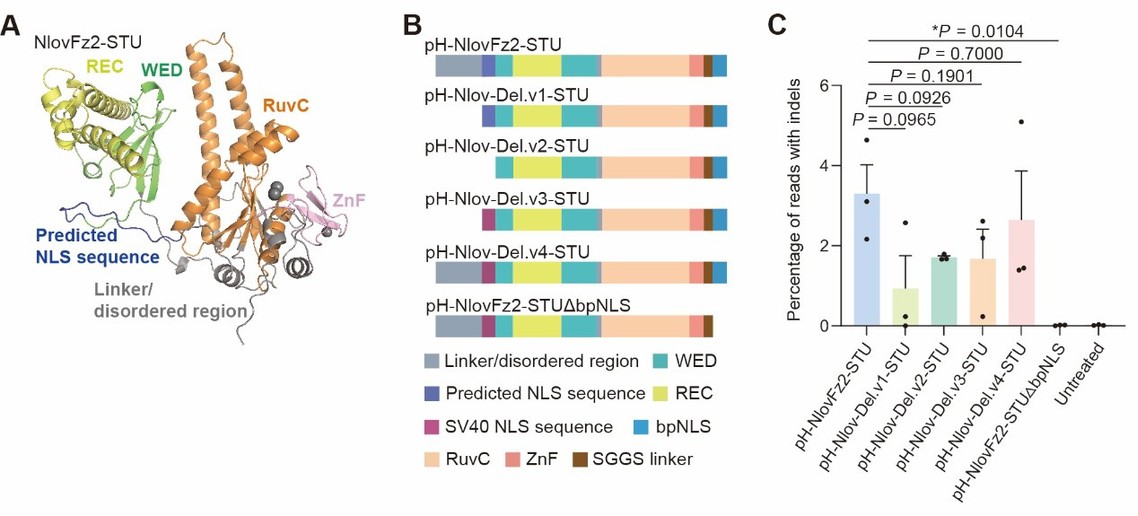 此外,研究团队采用AlphaFold3对NlovFz2的结构进行预测,发现NlovFz2蛋白N端存在一个含有类NLS信号的无序区域。为了验证无序序列对编辑效率的影响,研究团队构建了四种截短类型的NlovFz2-STU载体,并通过N端带有或不含SV40 NLS来验证预测类NLS的功能是否能被替代。与对照3.3%的编辑效率相比,Nlov-Del.v1(402 aa)和Nlov-Del.v2(387 aa)的效率均有所降低,分别为0.9%和1.7%,而N端添加了SV40 NLS的Nlov-Del.v3(403 aa)效率也仅为1.7%;在将预测的NLS替换为SV40 NLS后,效率恢复到2.7%,且与未截断对照相比无显著差异(P=0.7000),而pH-NlovFz2-STUΔbpNLS在删除STU载体C端的bpNLS后,活性则彻底丧失(图2)。