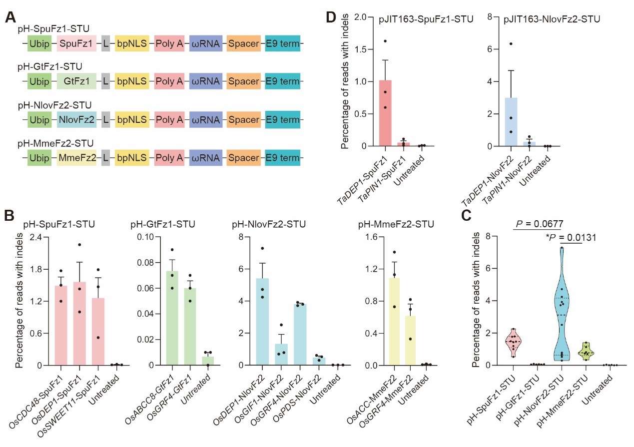 本研究首先构建了基于pCAMBIA1300骨架的STU载体,与需要核酶介导sgRNA成熟的Cas9-STU系统不同,Fanzor-STU系统因其Fanzor蛋白能够加工自身mRNA以生成功能性ωRNA而省略了核酶。研究团队在水稻原生质体中测试了4种Fanzor蛋白的活性,其中NlovFz2效率为2.8%,其次是SpuFz1和MmeFz2的效率分别为1.4%和0.9%,而GtFz1几乎未检测到活性(图1)。随后,团队在小麦原生质体中进行了活性测试,结果显示NlovFz2和SpuFz1分别在TaDEP1靶点实现了2.9%和1.0%的编辑效率,表明了Fanzor-STU载体构建策略在不同的作物中均能适用。