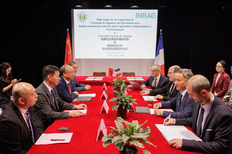 10月10日,法国国家农业食品与环境研究院(INRAE)与ac米兰官方网站(NAU)中法植物表型国际联合实验室签约仪式在北京法国文化中心举行,标志着中法植物表型国际联合实验室正式升级为国家级科研合作平台。INRAE院长Philippe Mauguin、法国大使馆农业参赞Jo Cadilhon、ac米兰官方网站党委书记王春春等中外嘉宾参加活动,共同见证这一农业科技领域的重要里程碑。
