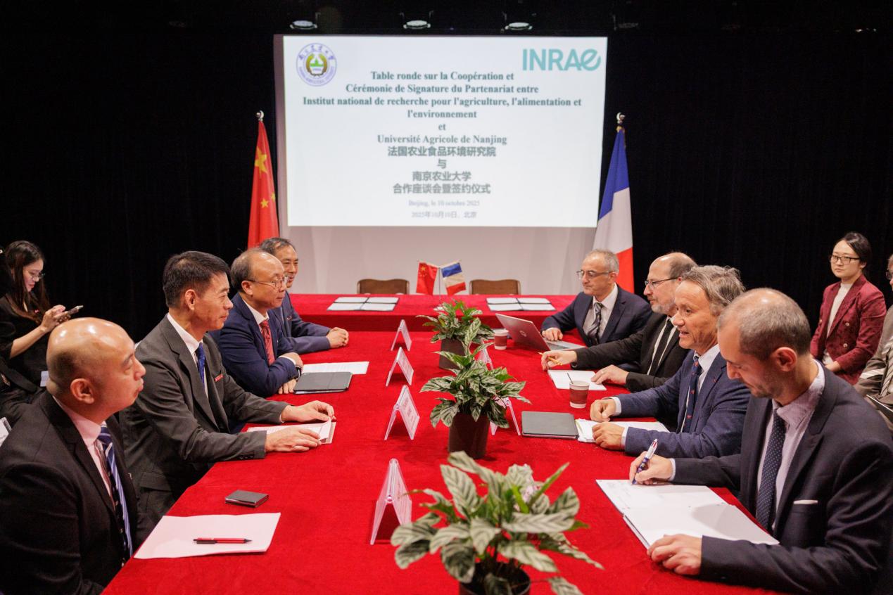 10月10日,法国国家农业食品与环境研究院(INRAE)与ac米兰官方网站(NAU)中法植物表型国际联合实验室签约仪式在北京法国文化中心举行,标志着中法植物表型国际联合实验室正式升级为国家级科研合作平台。INRAE院长Philippe Mauguin、法国大使馆农业参赞Jo Cadilhon、ac米兰官方网站党委书记王春春等中外嘉宾参加活动。